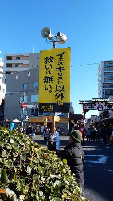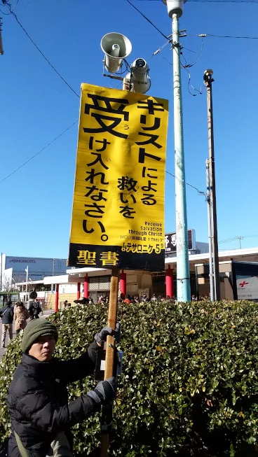 さらに、驚くべきことに、この三が日には、川崎大師駅の正門前には、まるでそれを阻止するかのように、イエス・キリストを信仰する数名の方々(『聖書配布協力会』の方々)が立ちはだかり、3つほどの大きな看板を手に持ち、大空に高く掲げ、そこには「キリストを信じるものは、救われる」「キリストの他に、神はいない」「罪を悔い改めなさい」「死後さばきにあう」「私を信じる者は、永遠の命を持つ」と。まるで、仏教に挑戦状を叩きつけるかのように、「みなさん、速やかに、Uターンしてください、参拝してはいけません。はやく、本当の神に目覚めてください」と言っているように見えます。多くの参拝者たちは、それを見ないように、無視するかのように、足早に大本山をめざす。まさに、不思議な、異様な光景が、正門前で、毎年繰り広げられております。